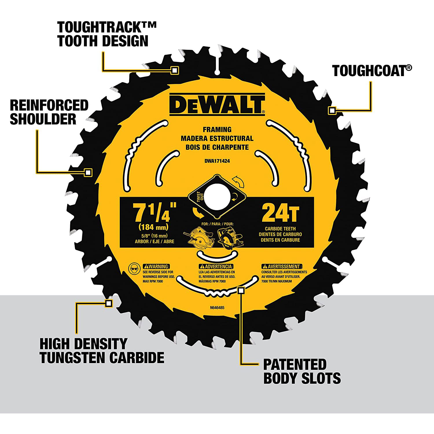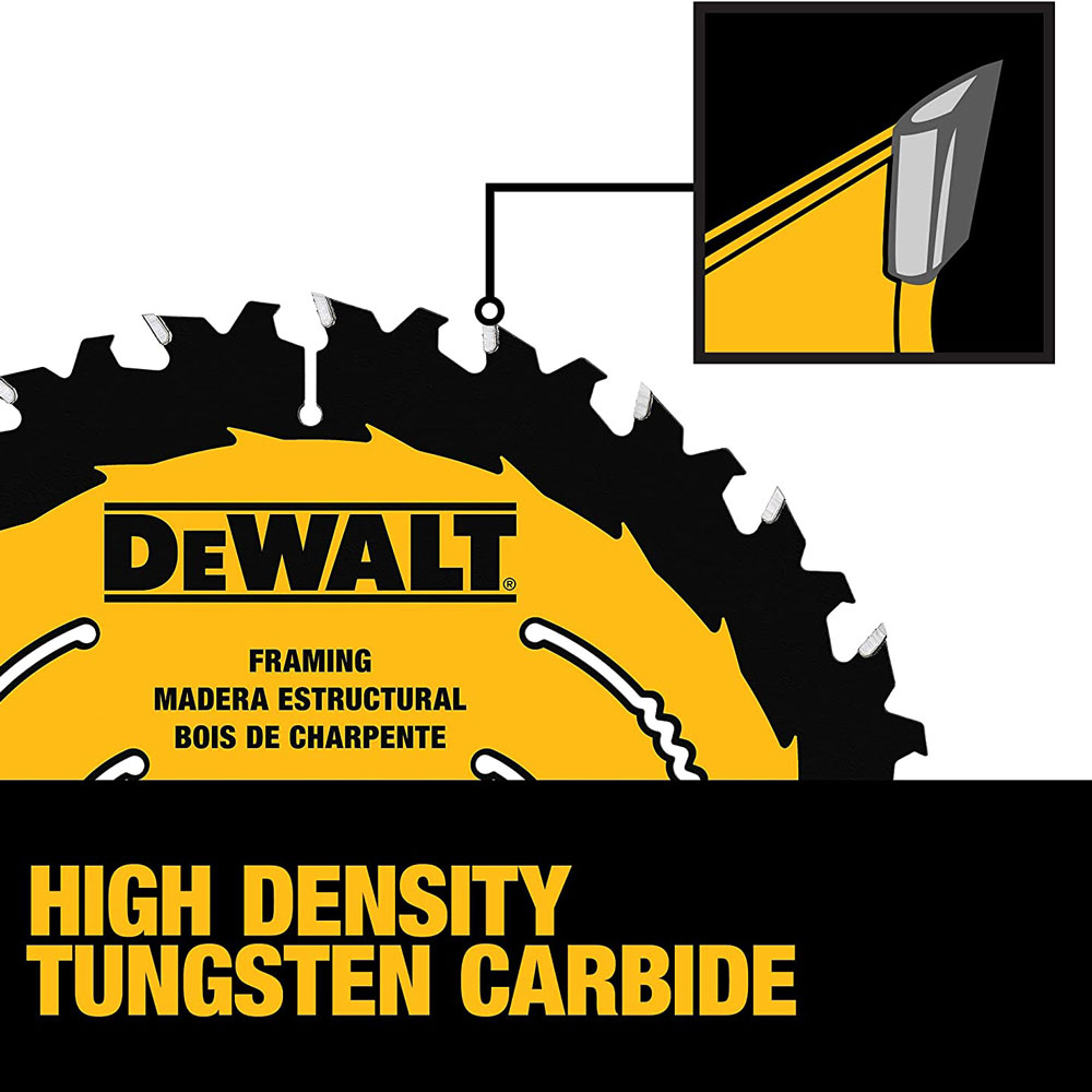 DEWALT Saw Blades are ideal for any wood-cutting application. The exclusive, \n patent-pending ToughTrack tooth design, on our framing & ripping blades, is engineered to deliver straight, accurate cuts over the life of the blade. Patented Body Slots reduce vibration, which works with the blade’s thin kerf design to deliver exceptional user feel. High-Density Tungsten Carbide teeth are tough, wear-resistant, and provide long life. The reinforced shoulder is designed for strength & durability by providing impact resistance, especially in nail-embedded wood. These blades come with ToughCoat anti-stick coating to reduce friction and gumming. Optimized for use on both corded and cordless circular saws.