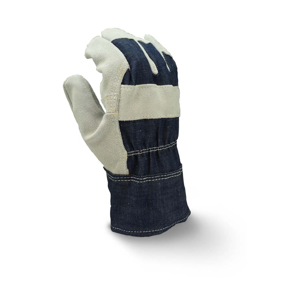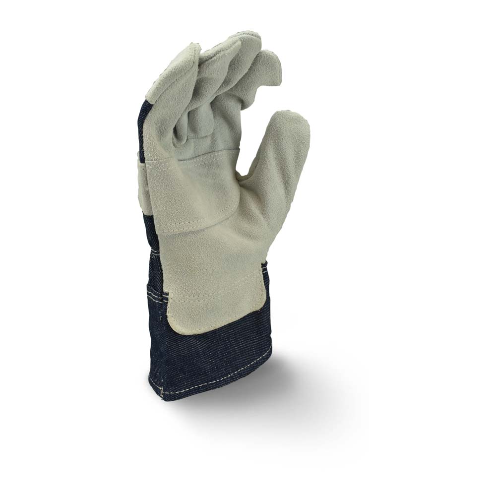 The Radians RWG3110 leather palm glove is a great economy option, featuring a shoulder leather palm with patch construction, gunn cut with a wing thumb, a leather knuckle strap, and a denim back and cuff for additional safety.