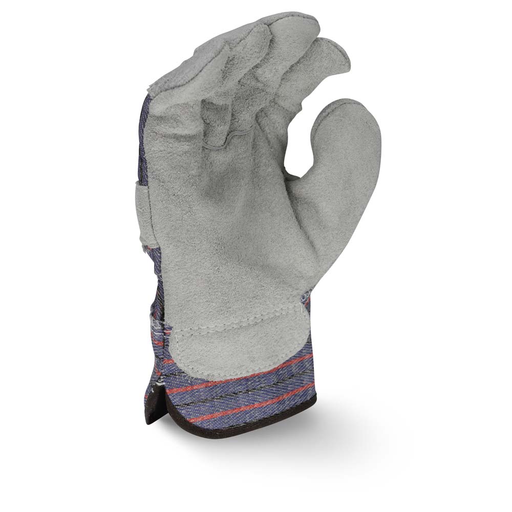 The Radians RWG3111 leather palm glove is a great economy option, featuring a shoulder gray split leather palm, gunn cut with a wing thumb, a leather knuckle strap, and a starch safety cuff.