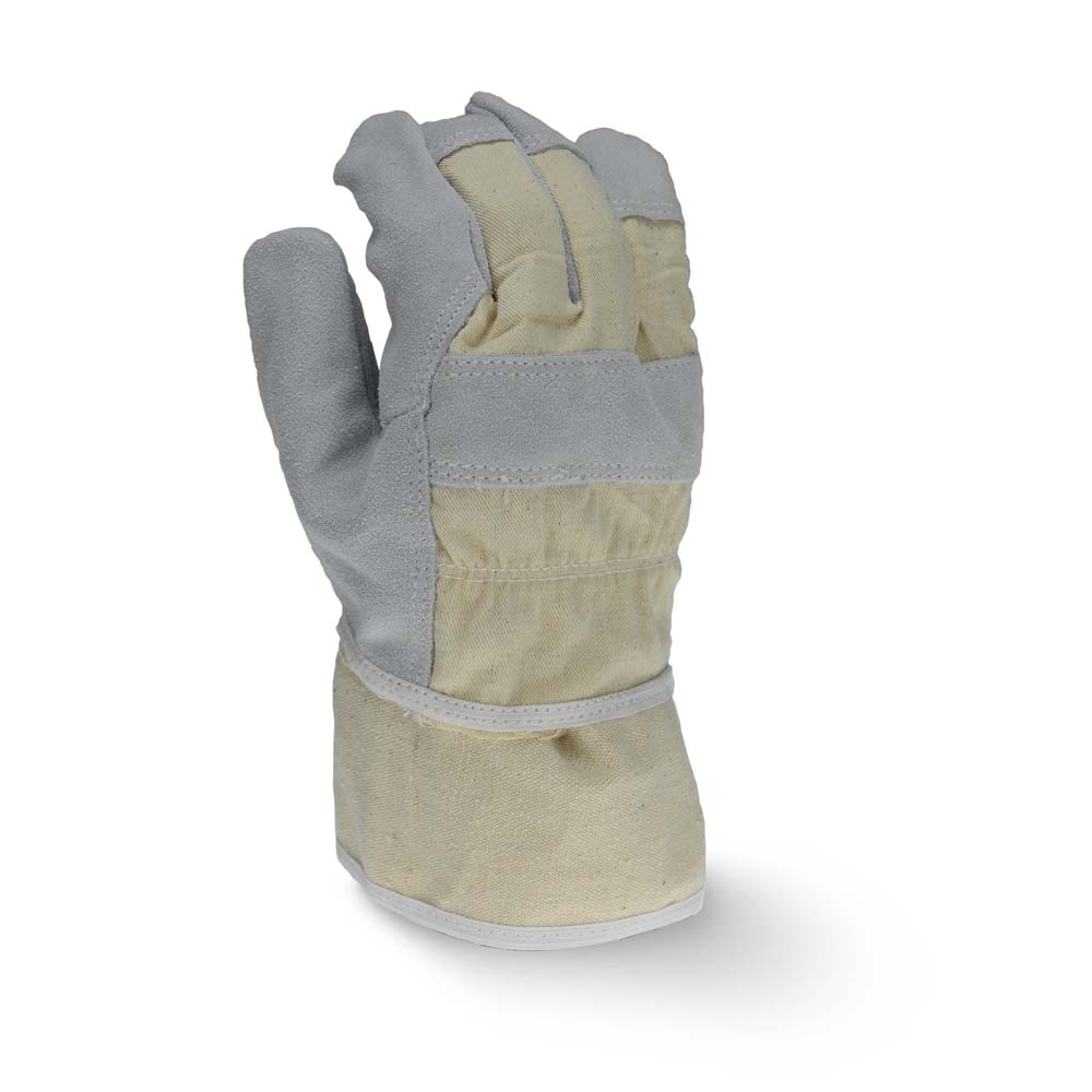 The Radians RWG3200W leather palm glove is a great leather option, offering a shoulder gray split cowhide joint leather palm, gunn cut with a wing thumb, canvas back, leather knuckle strap, and a rubberized safety cuff.