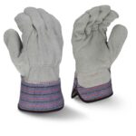 The Radians RWG3206 leather palm glove is a great leather option, offering a full regular shoulder gray split cowhide leather palm, gunn cut with a wing thumb, canvas back, leather knuckle strap, and a rubberized safety cuff.