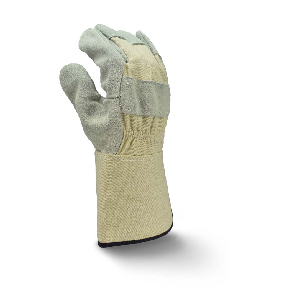 The Radians RWG3400W leather palm glove is a great leather option, offering a side split gray cowhide leather palm, gunn cut with a wing thumb, canvas back, aramid thread leather knuckle strap, and a gauntlet cuff.