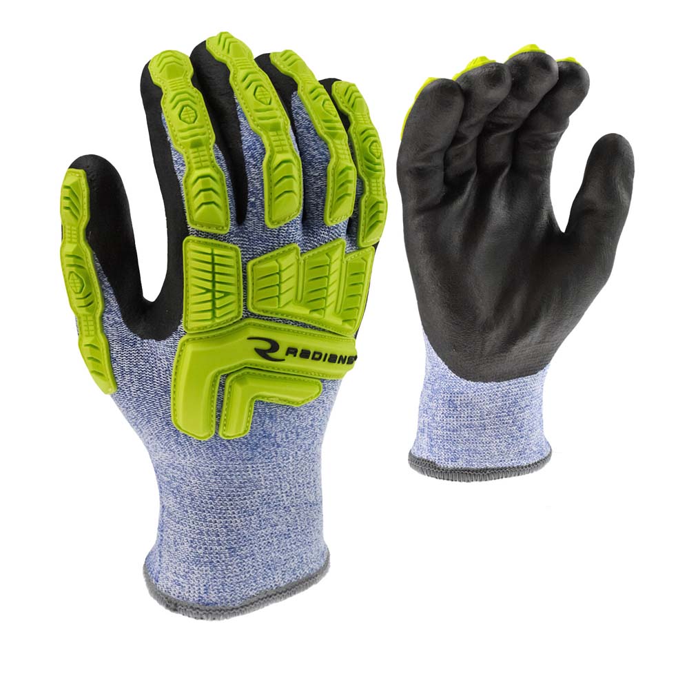 The RWG604 by Radians has an ANSI Cut rating of A4, EN388 cut rating of 5, and ANSI/ISEA Impact Level 1. The RWG604 glove features a 2 ply, 13 gauge blue and white HPPE shell to provide excellent protection from cuts and abrasion, while the 7 gauge acrylic terry liner provides warmth in cold conditions. The black micro nitrile palm coating provides a strong grip in both wet and dry applications. The high visibility TPR overlays on the back of the hand provides added impact protection.