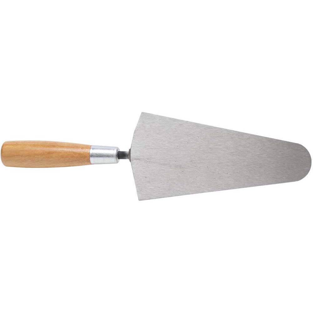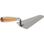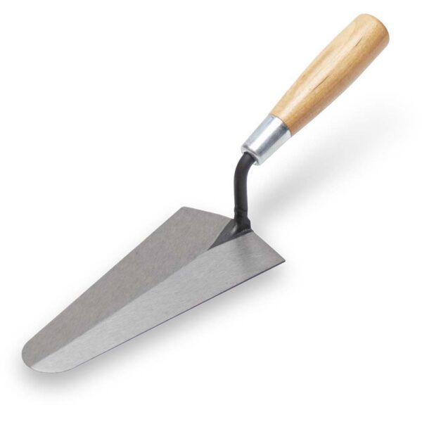 The MARSHALLTOWN Gauging Trowel is a versatile tool designed to gauge, mix, and apply precise quantities of quick-setting mortar or plaster to walls and surfaces. The 7-inch blade (7 in) with a width of 3 3/8 inches (3 3/8 in), or 178 mm by 86 mm, features a distinct V-shaped back and broad rounded tip, forged from a single piece of high-carbon steel for outstanding durability and performance. The traditional wooden handle offers a sturdy, reliable grip, reinforced with a metal ferrule for added strength. This trowel is ideal for professionals looking for a durable tool to handle the demands of plastering or masonry projects.