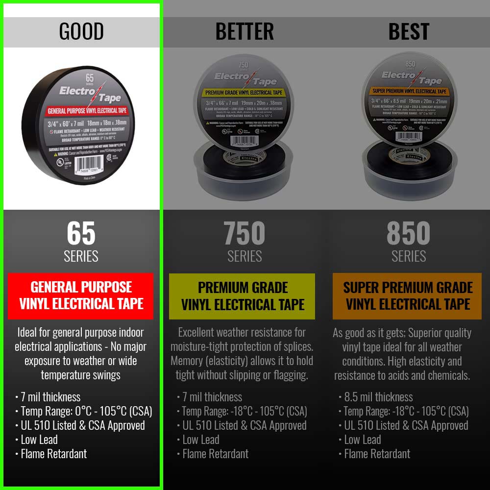 Electro Tape’s 65 Series is a conformable 7-mil thick vinyl plastic tape designed to perform in temperature environments up to 80°C (176°F). 65 Series has excellent resistance to: acids, alkalies, abrasion, moisture, corrosion and varying weather conditions (i.e.: sunlight). With its memory (elasticity), 7-mil thickness and adhesion characteristics, it provides moisture-tight electrical and mechanical protection.