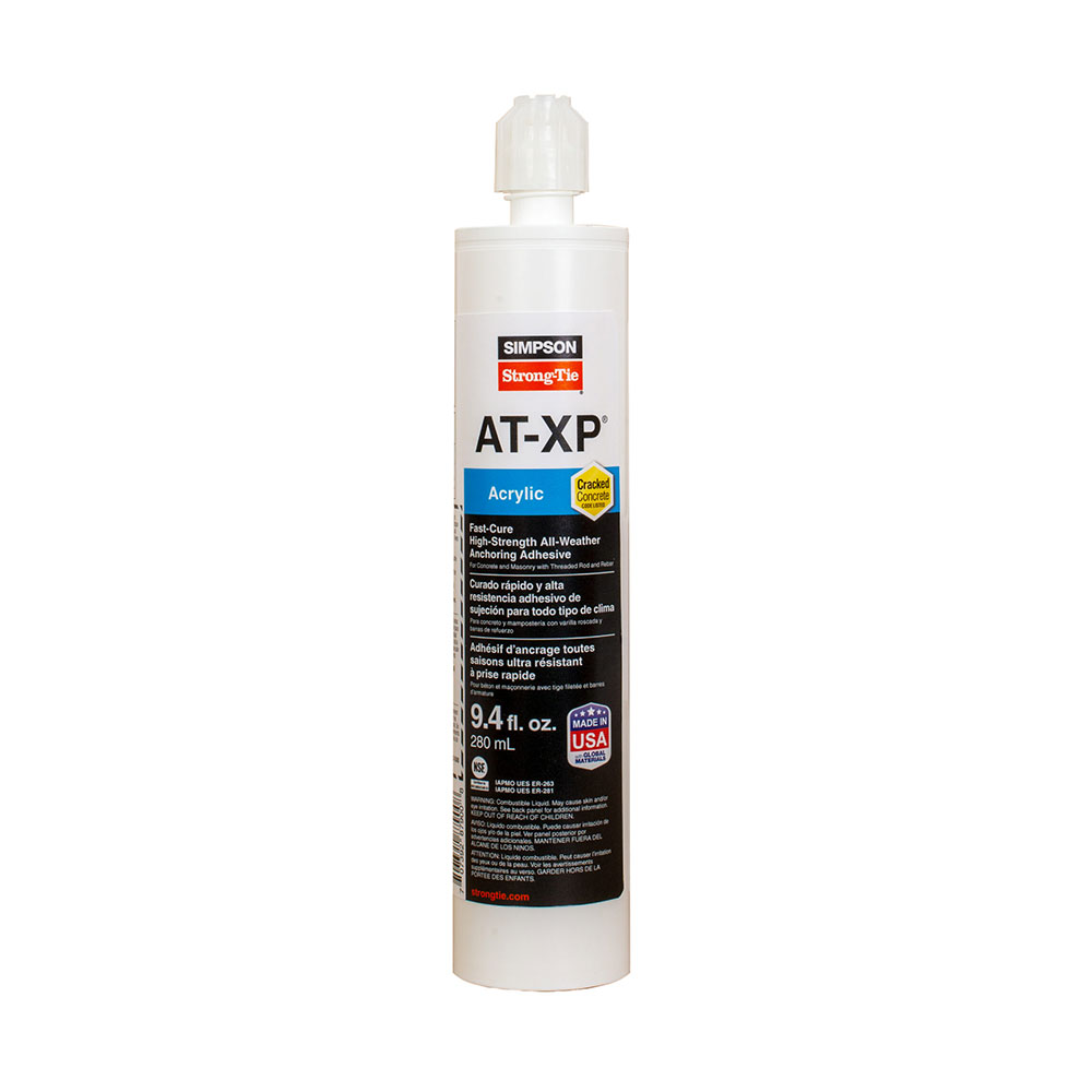Simpson Strong-Tie acrylic adhesive delivers consistent performance for high-strength anchor grouting in a wide range of weather conditions. Our acrylic formulations cure fast and are suitable for damp, wet or water-filled holes. AT-XP is a fast-curing anchoring adhesive for cracked and uncracked concrete. It has been formulated for high-strength anchorage of threaded rod and rebar into concrete under a wide range of conditions. AT-XP adhesive dispenses easily in cold or warm environments with little to no odor, and when mixed properly is a teal color for easy post-installation identification.
