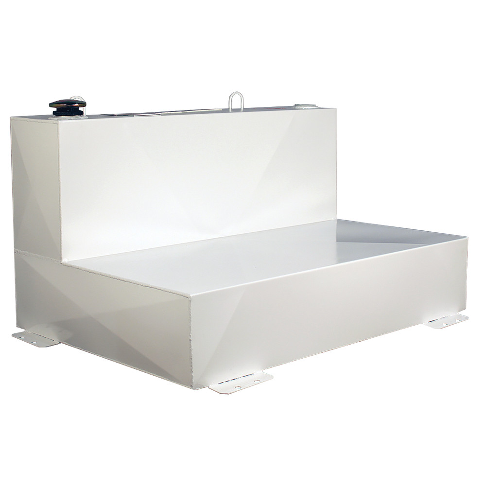 The BETTER BUILT 75-gallon white steel transfer tank provides a safer way to transport non-flammable liquids such as diesel fuel and hydraulic fluid. Built from 14-gauge steel and 100% pressure tested, it features a durable powder coat finish for added protection. An internal baffle design increases strength and helps prevent rapid liquid shifting. The L-shape design allows saddle or gull wing truck boxes to be installed alongside the tank. Includes an installation kit with vibration reduction hardware. Backed by a 3-year limited warranty.