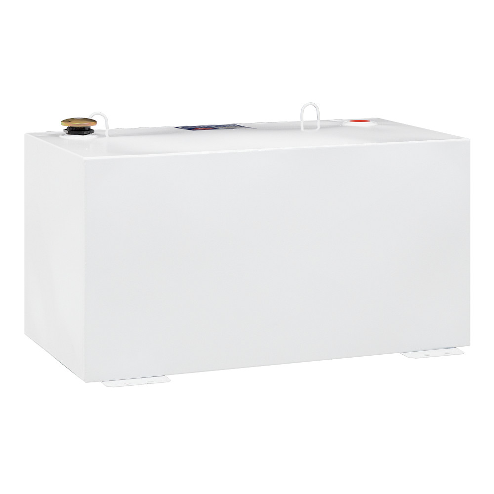 The rectangular 96-gallon steel transfer tank provides a safer way to transport non-flammable liquids such as diesel fuel and hydraulic fluid. Built from 14-gauge steel and 100% pressure tested, it features internal baffles to minimize liquid movement and increase strength. A durable white powder-coat finish resists wear, and the included installation kit uses vibration-reduction hardware. Backed by a 3-year limited warranty.