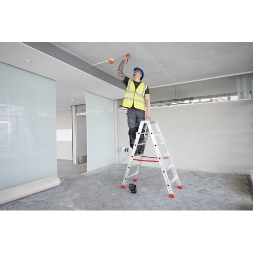The GCL165-42GL provides bright green lines and plumb points for fast, accurate layout. It offers power flexibility via the included 3.7V Li‑Ion 3.0Ah battery or AA batteries (adapter included) and supports USB‑C charging, even while operating. Built-in VisiMax technology manages power for maximum visibility and runtime. The jobsite-tough design features a full rubber overmold and IP65 rating. A fine adjustment knob with pivot rotation keeps the mount centered on the plumb point for precise point‑to‑point alignment. Working range is 100 ft, extendable to 330 ft with an optional receiver, with 1/8 in accuracy at 30 ft. Includes battery, alkaline adapter, fine-adjustment mount, USB‑C cord, and hard case.