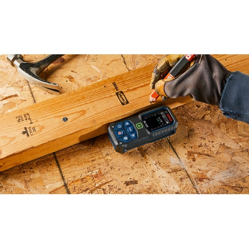 This fully featured digital laser measure delivers bright green-beam visibility, an easy-to-read backlit color display, and robust construction. It provides accuracy up to ±1/16 in. and measures up to 165 ft. Functions include real-time length, length, area, volume, indirect measurements, and add/subtract capability. The tool features an IP65 rating, full rubber overmold housing, rounding button, and haptic feedback for loud jobsites. Includes (1) GLM165-25G, belt clip, (2) AA batteries, and pouch.