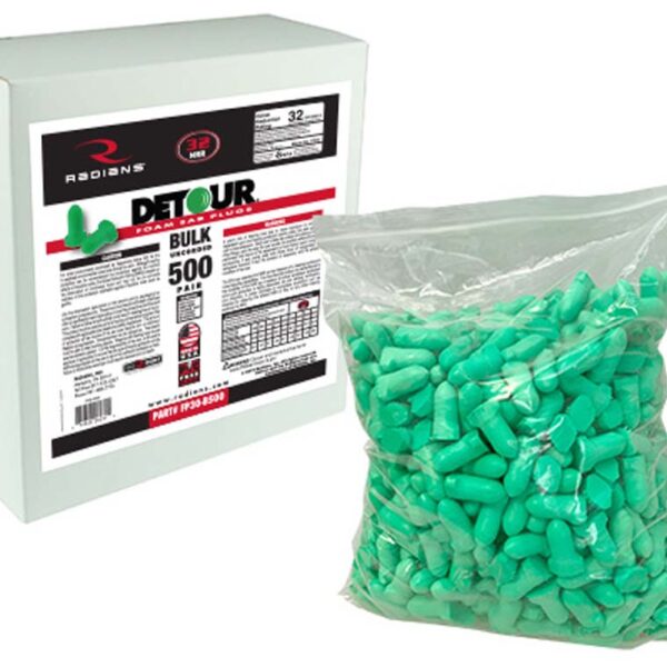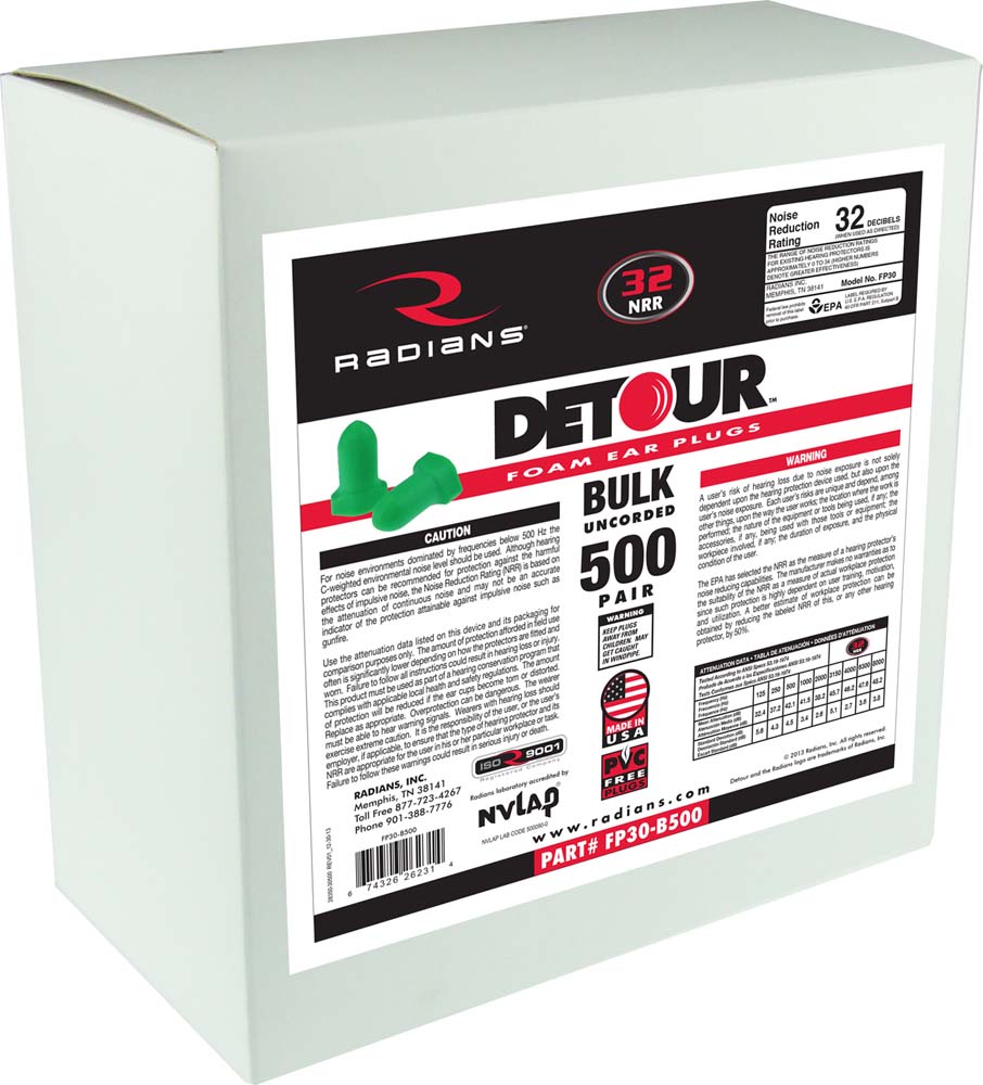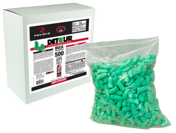 Tested according to ANSI specs S3.19-1974, Radians Made in the USA, DETOUR disposable foam earplugs feature soft, slow-recovery foam for extreme comfort and outstanding noise reduction to protect your hearing. They are easy to roll down and insert, and they expand slowly for a low-pressure fit in virtually any size ear canal.