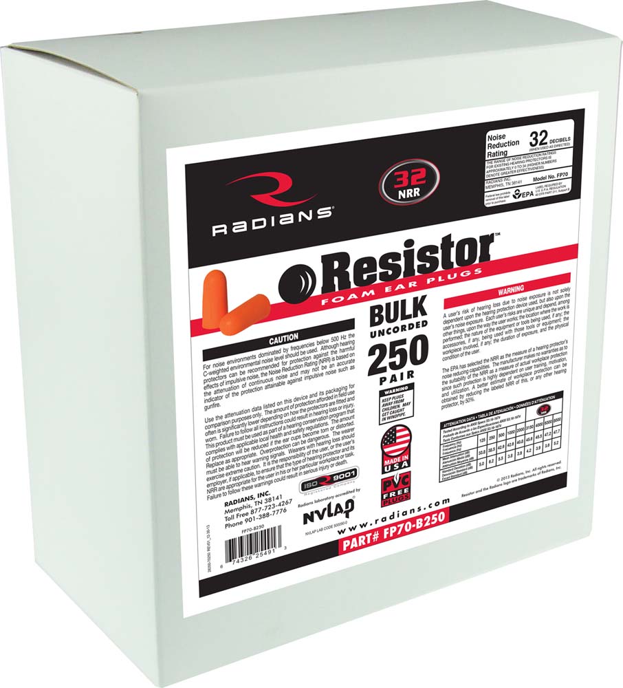 [Box] Radians FP70-B250 Resistor 32 Foam Uncorded Earplug Dispenser Refill – 250 Pair