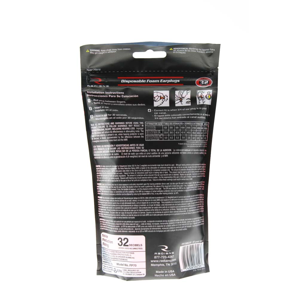 Radians Foam Earplugs have a tapered shape and offer the most natural fit and seal for the ear canal. Smooth shiny surface repels dirt. Low pressure, self adjusting foam offers long wearing comfort and quick recovery time.