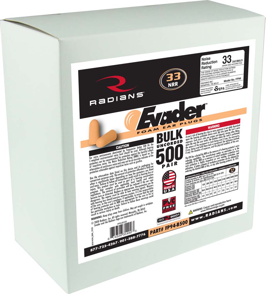 Tested according to ANSI specs S3.19-1974, EVADER Made in the USA foam earplugs feature soft, slow-recovery foam for extreme comfort and outstanding noise reduction to protect your hearing. Designed for a comfort fit, theyre easy to roll down and insert, and they expand slowly for a low-pressure fit in virtually any size ear canal. The Radians EVADER Foam Earplug 500 Pair Dispenser Refill are bulk packed individual earplugs designed to be used with the FPD-500L94 Refillable Dispenser.