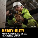 - Heavy-duty 1/2″ ratcheting nitro-carburized metal chuck with carbide inserts for superior bit gripping strength