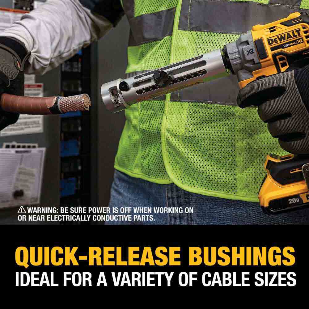 The 20V MAX XR Brushless Cable Stripper cleanly and consistently strips electrical cable without an exposed knife. It quickly strips copper and aluminum cable from 6 AWG to 750 MCM CU and 900 MCM AL. Quick-release bushings and a reference chart are included to cover the range of cable diameters. Put down the wire stripper blade and increase productivity with this innovative solution for large diameter cable stripping.