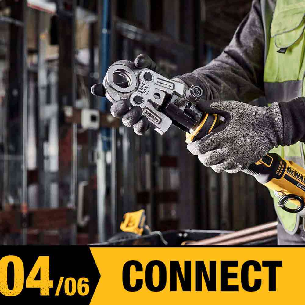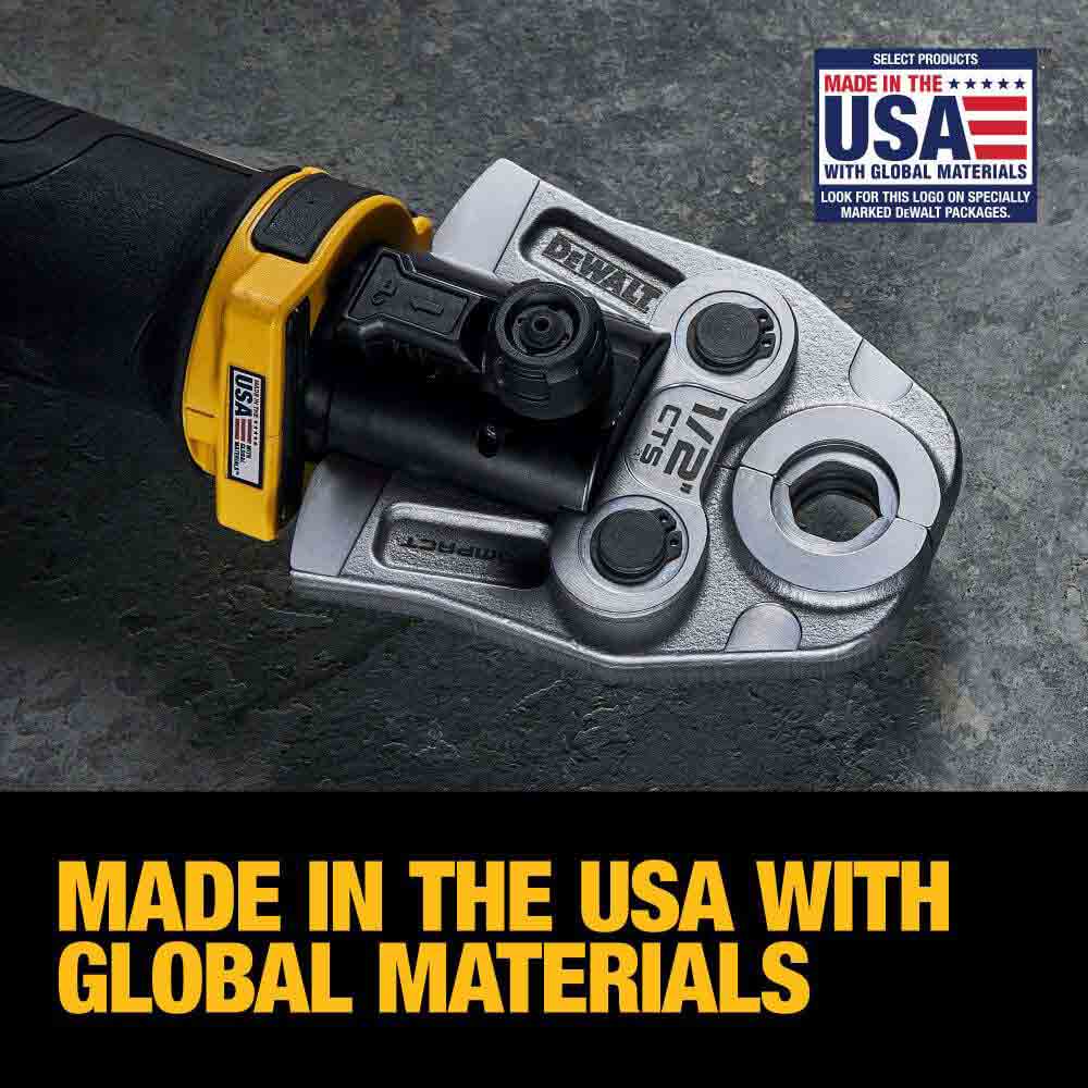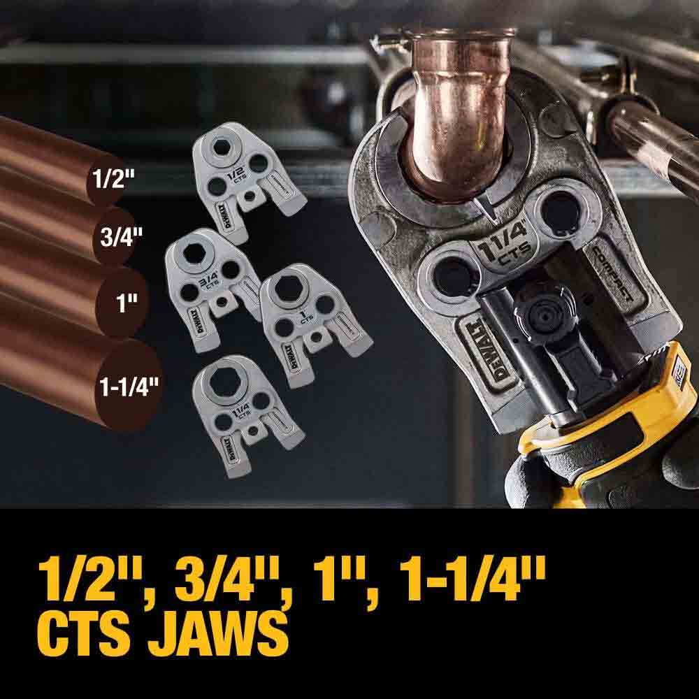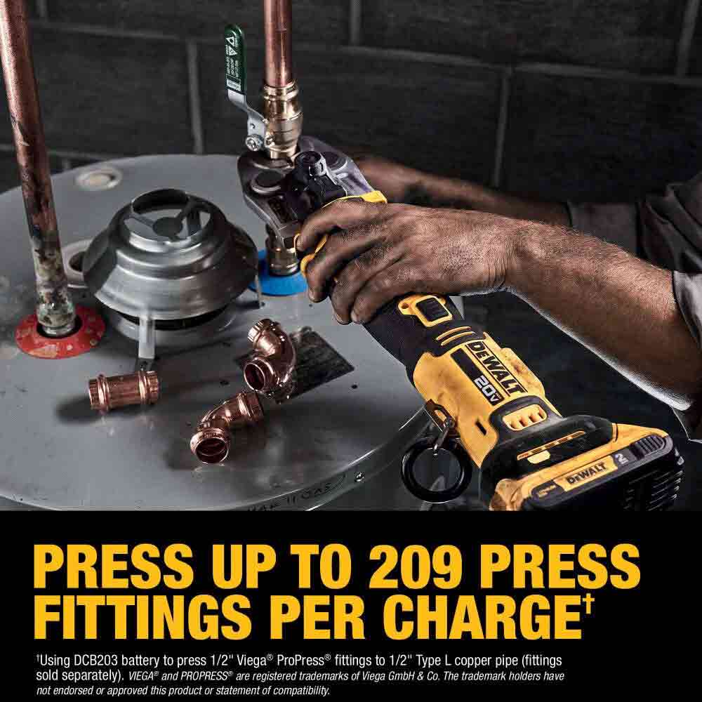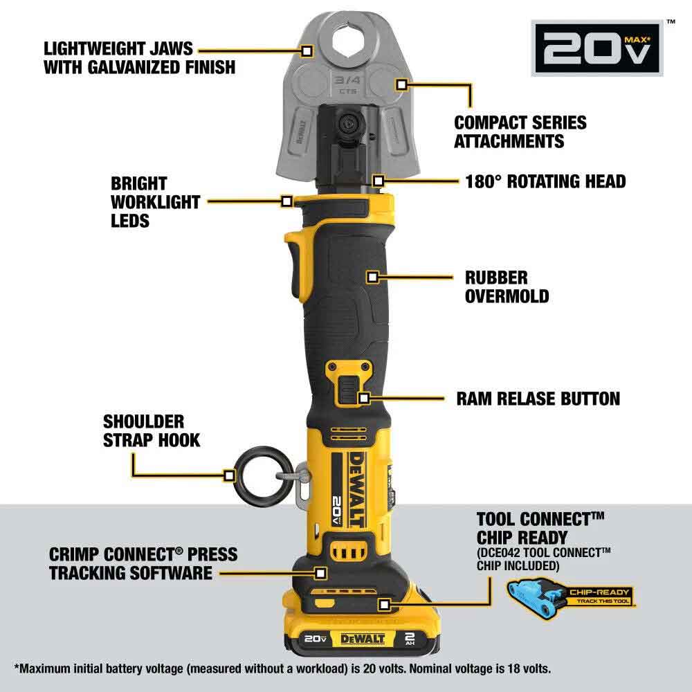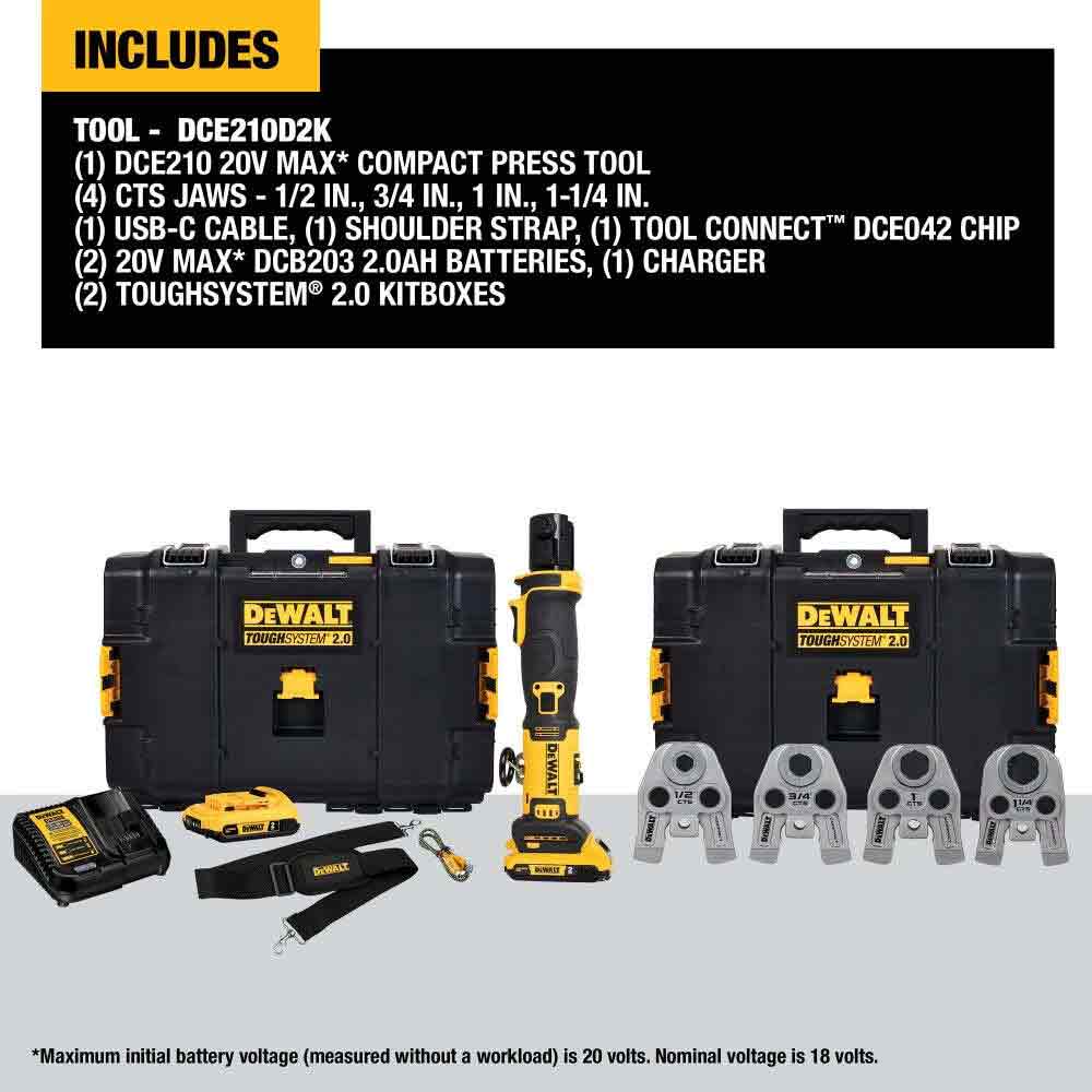 The DEWALT 20V MAX* Compact Press Tool kit (DCE210D2) provides broad press versatility in a lightweight, inline, design that allows for overhead and one-handed pressing in small spaces; making it an outstanding solution for the pipe trades. The DCE210D2K kit is compatible with all DEWALT compact series presssing attachments and includes 4 DEWALT Compact CTS jaws with a 1/2″ to 1-1/4″ copper press capacity. Onboard designs and features include a 180° rotating head allowing for best press angles, an LED worklight for excellent press location visibility, Crimp Connect software to generate press cycle data tracking, a ram release button allowing for cycle reset, and a TOOL CONNECT Chip (DCE042) for tool inventory tracking via the TOOL CONNECT platform. The DEWALT DCE210 is compatible with most professional-grade press fitting brands when used with the DEWALT Compact series press attachments. Please reference the compatibility chart for complete listing. The DCE210 utilizes DEWALT’s fastest growing battery system, joining 300+ products on the 20V MAX* line, each engineered to meet the specific needs of the most demanding trades
