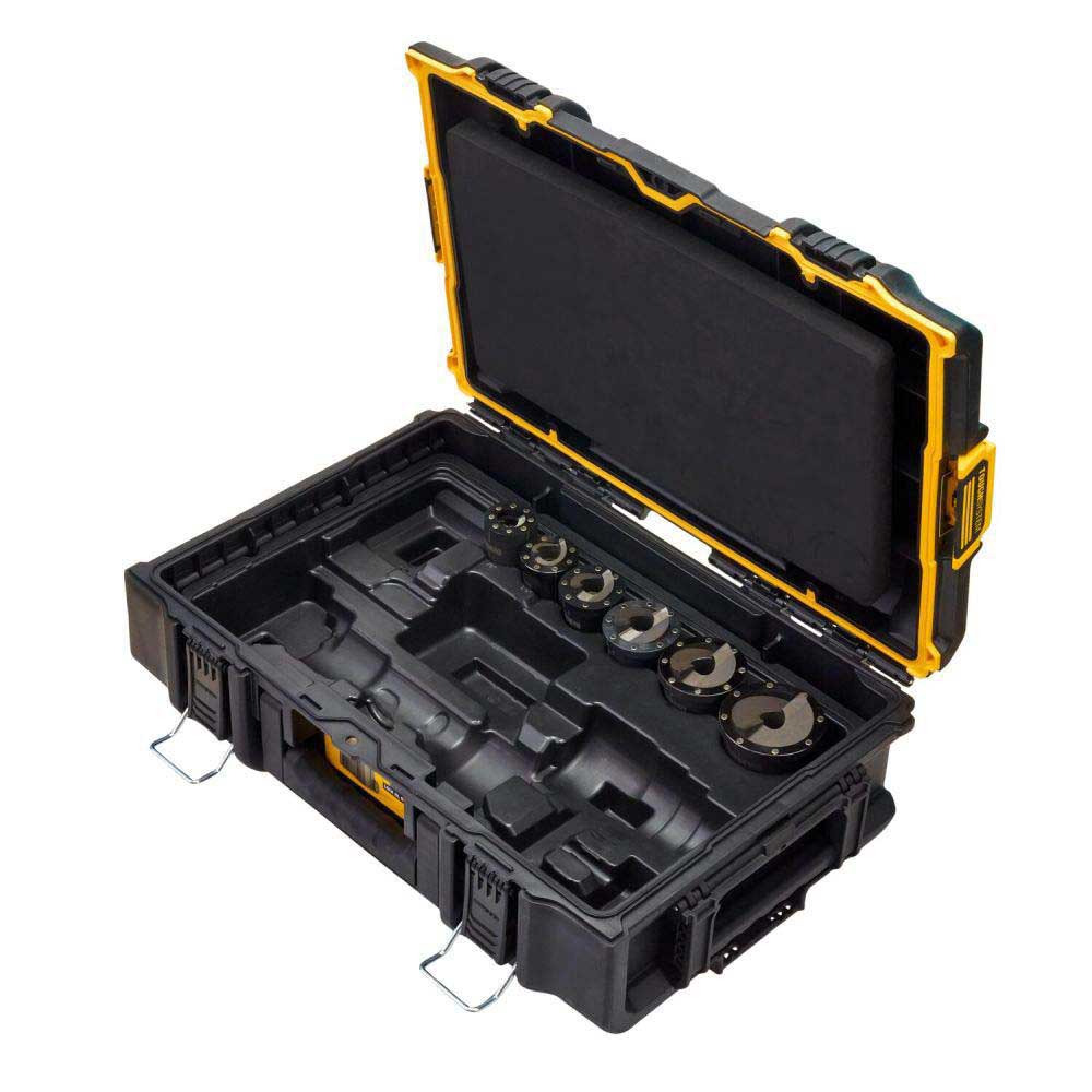 Cleanly knockout conduit holes with the DEWALT DCE6002K 1/2” – 2” Knockout Punches and Dies Kit. The DCE600 knockout dies contain embedded magnets which attach to mild steel, to maximize precision in punch alignment. Punches and dies include laser etched markings to easily distinguish between sizes. Punches split slugs ranging from 1/2” – 2”, allowing ease of use in disassembling the system once the knockout is completed. Keep everything organized with the included TOUGHSYSTEM 2.0 Tool Box. The punches and dies are designed for use with the DEWALT DCE600 20V MAX* Hydraulic Knockout Tool (sold separately).