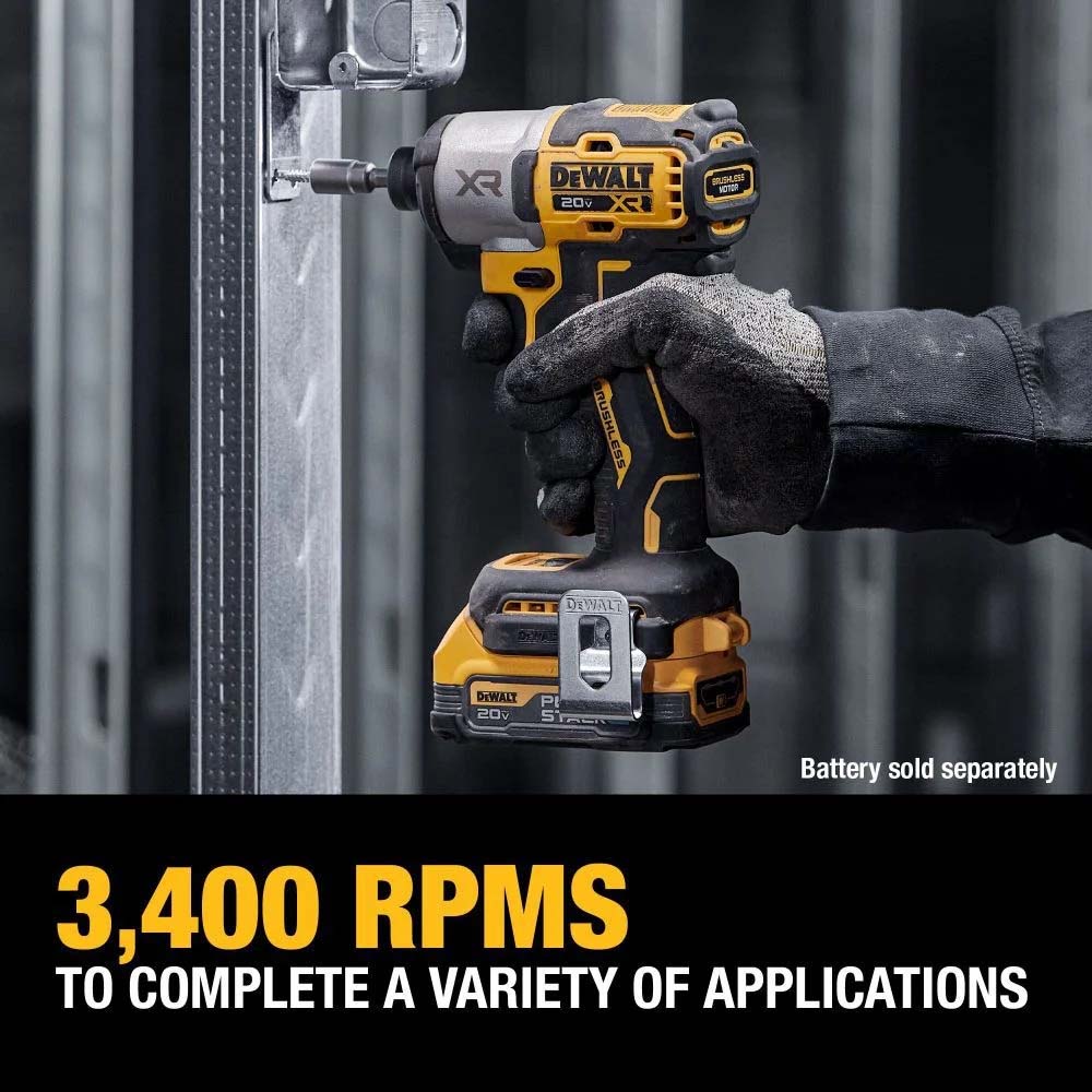 This 20V MAX* XR in. 3-Speed Impact Driver is lightweight yet powerful with a brushless motor that delivers 1,825 in-lbs. of max torque to drive large diameter screws. The 3-speed switch allows for increased user control and precision for various applications to help maximize versatility on the jobsite. Maintain productivity in low-light spots with a 3-LED on-board work light that helps to illuminate dimly lit workspaces. This cordless impact driver comes Chip Ready (chip sold separately) to track the tool’s location with the DEWALT TOOL CONNECT Site Manager App. Battery and charger sold separately.