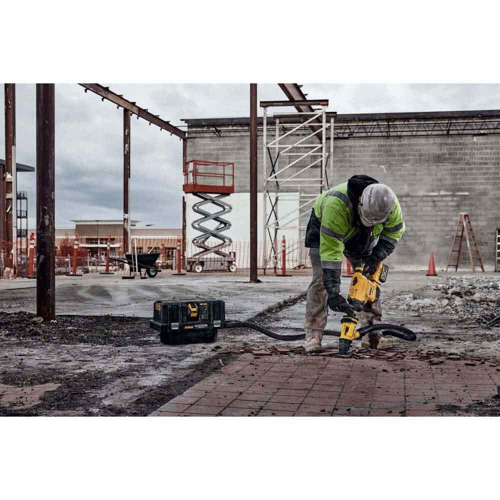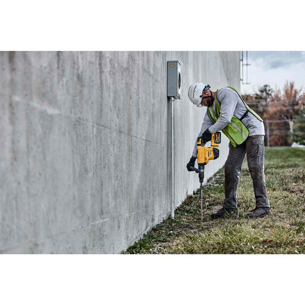 Powered by a high-performance motor, the durable DCH832X1 60V MAX 15 lb. Cordless SDS Max Chipping Hammer is designed to help you tackle a variety of challenging demo work. The hammer is engineered for fast chipping on hard concrete and delivers up to 10.5 J of impact energy. From remodeling projects to general contractor jobs, the versatile hammer can handle a wide variety of applications while maintaining a consistent speed under load with constant-speed electronics. This highly maneuverable, midweight power tool can be used for can be used for horizontal chipping in upper or lower wall areas and concrete surface preparation applications. Built for comfortable operation, the SHOCKS Active Vibration Control system helps reduce vibration felt by the user at the handles compared to rotary hammers without this feature. WIRELESS TOOL CONTROL technology enables the user to link the tool to the DCV585 60V MAX dust extractor (sold separately) for remote extractor activation. This cordless chipping hammer comes Tag Ready so individuals and companies can attach a DEWALT Tag (sold separately) to track its location via the DEWALT Tool Connect app.