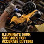 DEWALT DCS371P1 20 V max lithium ion band saw kit features a 2-1/2 In. cut capacity, capable of cutting up to 2 In. SCH 40 pipe. A centered handle position provides superior balance and ergonomics and allows for more accurate cuts and less user fatigue. It has an LED work light with 20 second delay that illuminates dark work surfaces for accurate cutting, along with an integrated hang hook that allows user to hang the saw without damaging the front handle or base. A blade tracking adjustment increases blade life by providing better blade tracking, and dual bearing blade guide rollers provide increased durability in the blade support system. Cutting speed: 570 spm, max cutting (round): 2.5 In., max cutting (square) 2.5 In., blade length: 32-7/8 In.. applications include: conduit up to 2 In. DA., 1-5/8 In. unistrut, SCH 40 pipe up to 2 In., threaded rod, square and rectangular tubing, and angle iron.