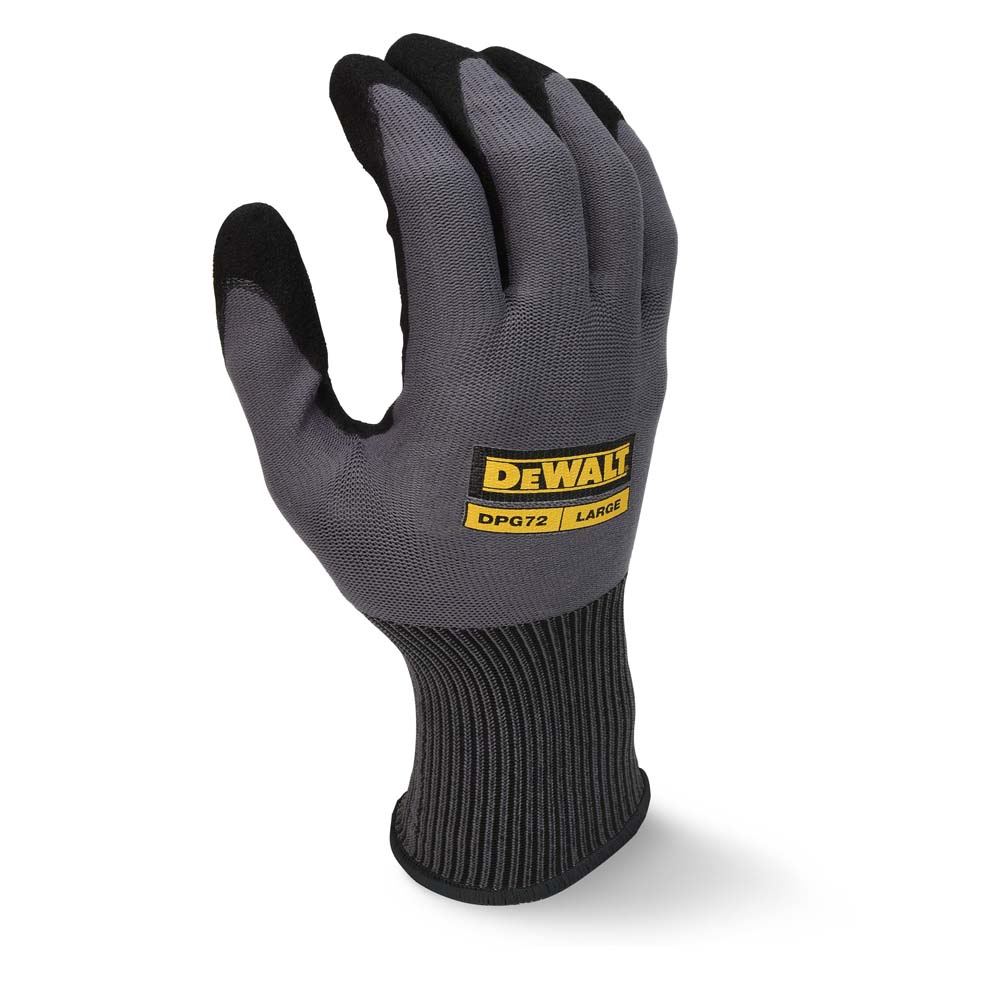 The DEWALT DPG72T is a 13-gauge nylon shell glove that features a double-dipped Flexible Durable Grip coating to improve grip and abrasion resistance. It also features a water-resistant palm, offering an excellent grip in wet and oily conditions. Tagged for retail display.