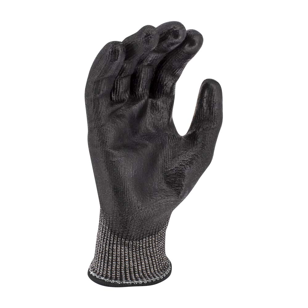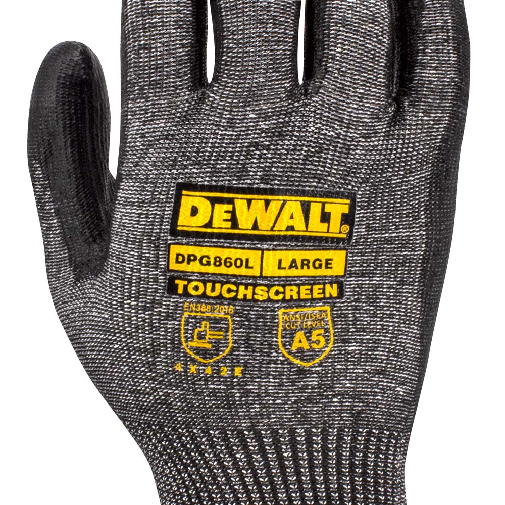 The DEWALT 13-Gauge Nylon HPPE Cut Glove with fiberglass provides dexterity, comfort, and the convenience of touchscreen capability. The polyurethane palm dip provides protection from abrasion in wet or dry conditions. For use in construction, automotive, HVAC, metal fabrication and manufacturing.