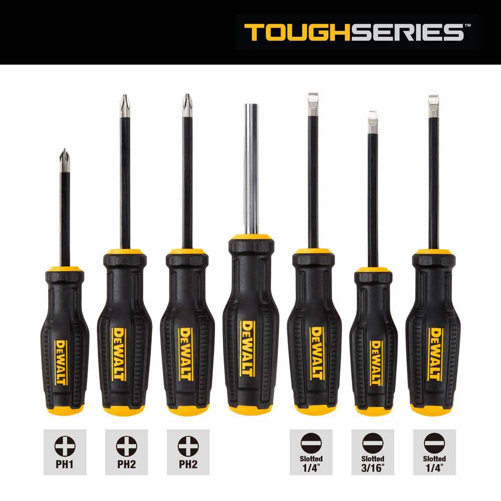The new DEWALT TOUGHSERIES demolition screwdriver set is built to handle whatever punishment the jobsite can throw at it. A black chrome finish and a nickel coated tip has been added to improve corrosion and rust resistance 10X current levels. The set is equipped with S2 steel bars, which offer increased durability and bend resistance, as well as it’s precision machined MAXFIT tip geometry for better contact with fasteners to reduce both slippage and stripping. Both screwdrivers include metal end-caps and through-tang shafts for efficient transfer of force from end-cap to tip. Lastly the soft, ergonomic, bi-material grip offers maximum comfort and torque.