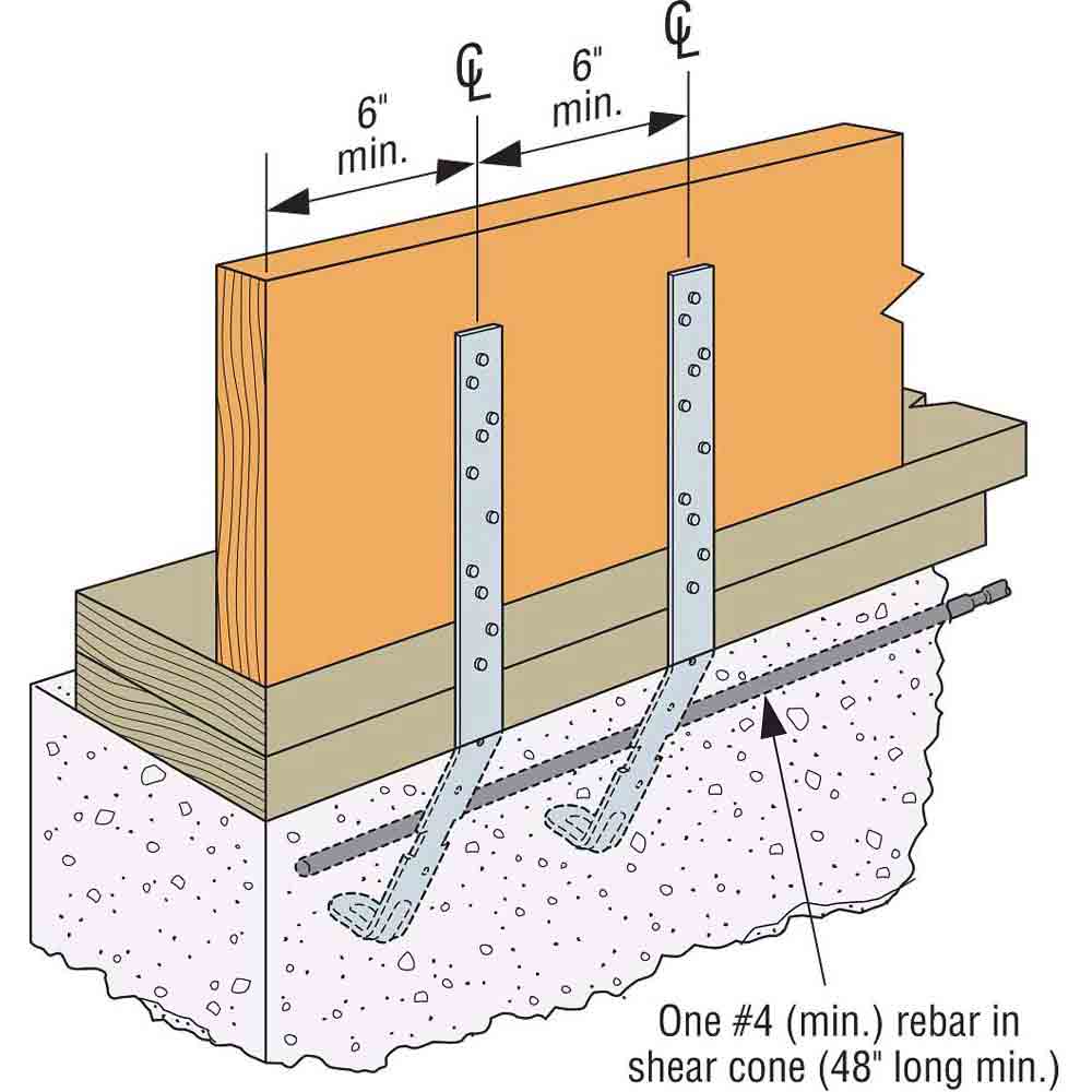 - Embed 4 in. into a poured concrete bond beam or grouted block wall