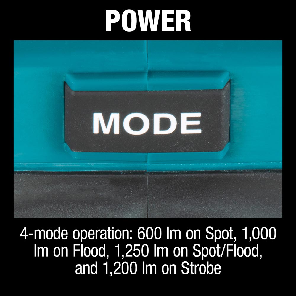 The Makita® 18V LXT® L.E.D. Flashlight/Spotlight (DML812) delivers bright illumination, versatility, and convenience. The flashlight has 4 modes of operation: Spotlight, delivering 600 lumens, Floodlight, delivering 1000 lumens, Spot/Flood delivering 1250 lumens, and Strobe.