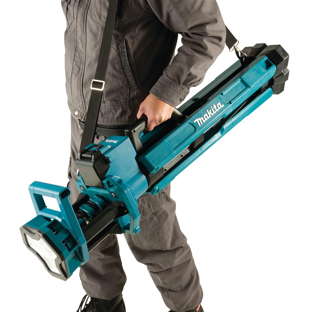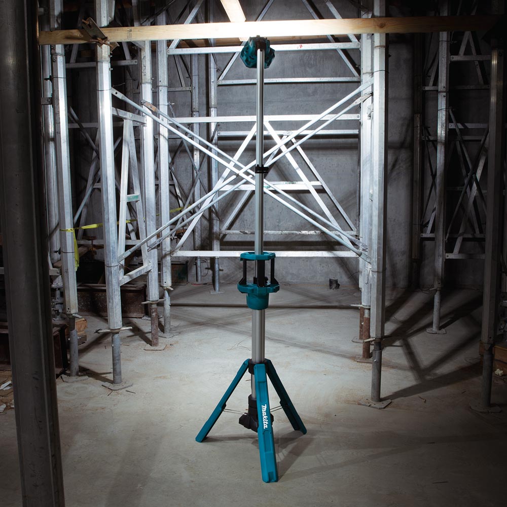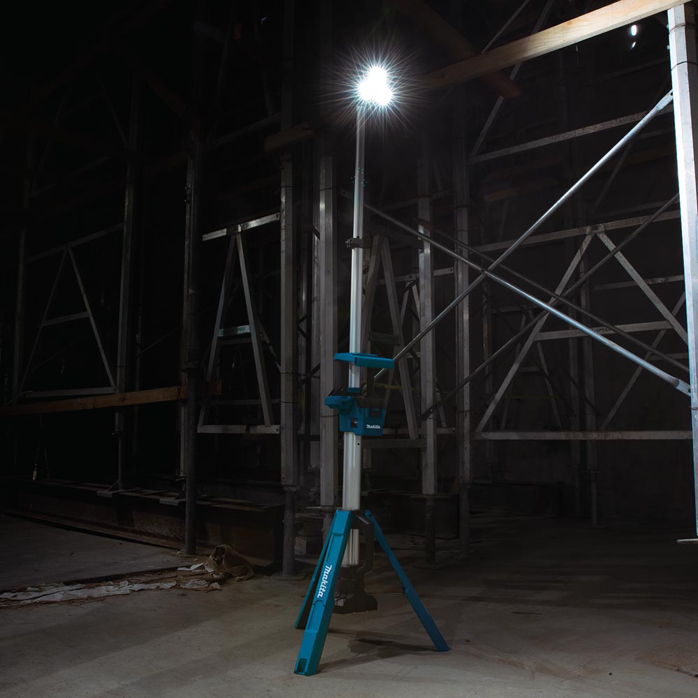 The 18V LXT® Tower Work Light (DML813, tool only) is a tall, towering light extending to an overall height of 7-1/4 feet. It delivers 3,000 /1,700 /900 lumens on High / Medium / Low settings.