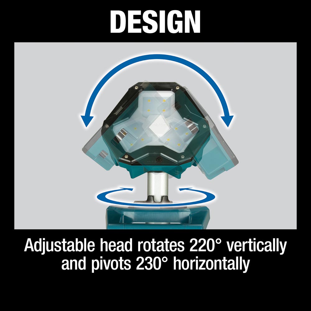 Get up to 10 hours of continuous illumination with one 18V LXT 5.0Ah Battery on low and up to 3 hours on high (battery and charger not included). L.E.D. lights effectively illuminate work area without the high heat of halogens. This tower light features an adjustable head that rotates 220-degrees vertically and pivots 230-degrees horizontally.