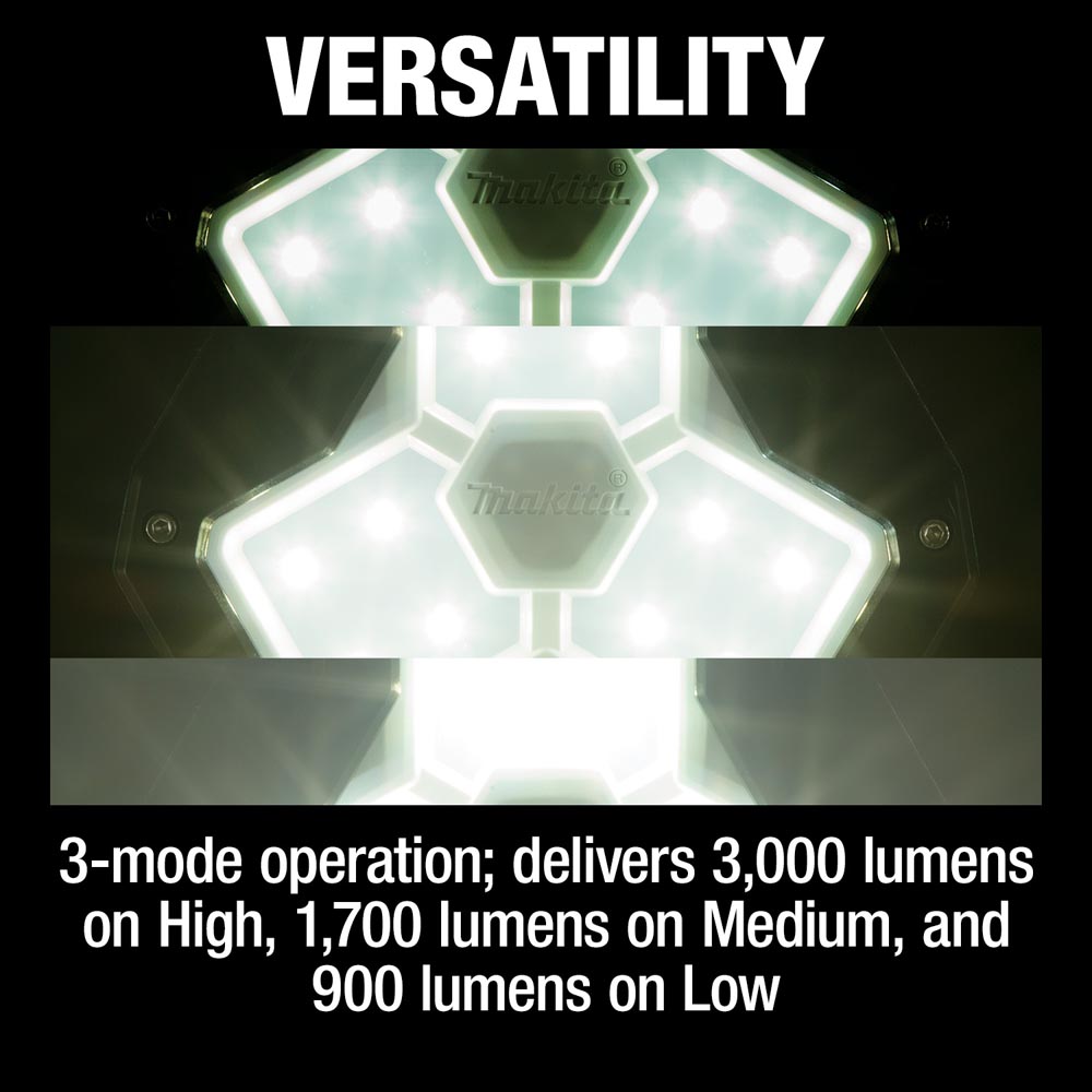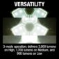 - 3-mode operation; delivers 3,000 lumens on High, 1,700 lumens on Medium, and 900 lumens on Low