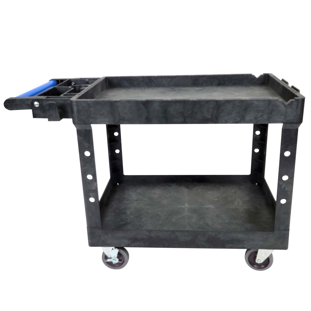 The most versatile utility cart to date, featuring different configuration options depending on your need. The adaptable handle can be installed flat or ergonomically. Tough polypropylene structural foam construction for years of rugged durability. V-Cut securely holds material to assist with accurate measuring and cutting. Mounting points for hooks, poles and other accessories. Comes with the five inch heavy duty casters.