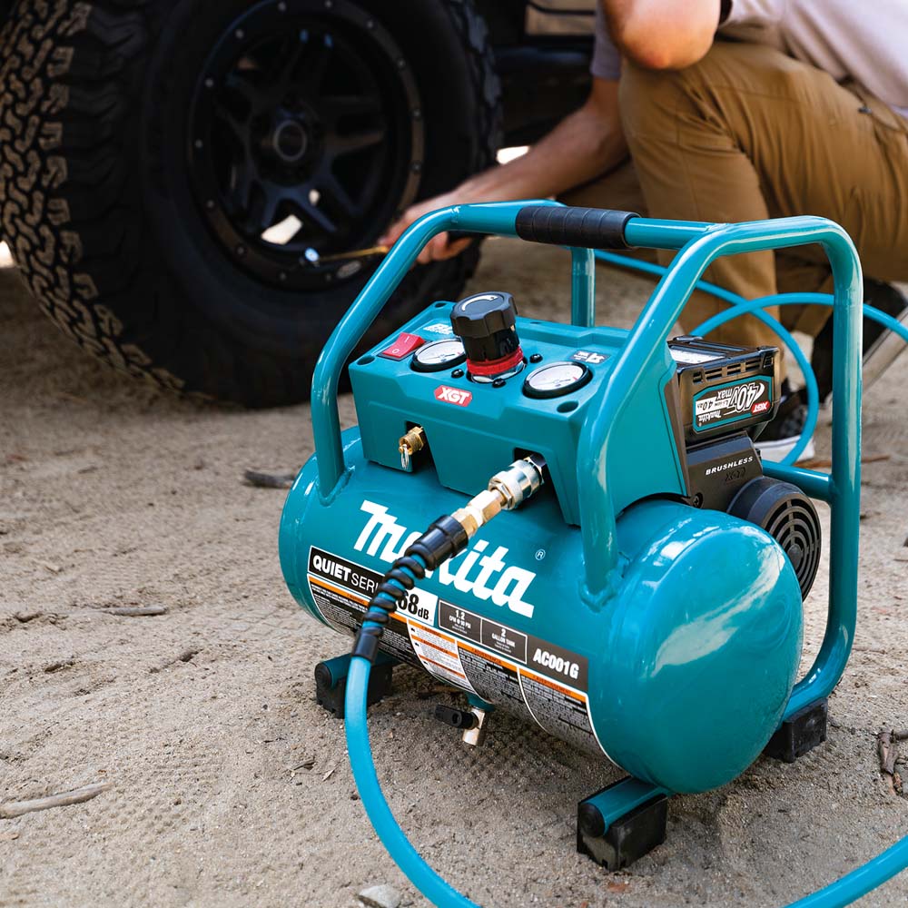 Compressors are workhorse tools on the job site and in the workshop. Makita® Air Compressors are favorites for their faster recovery time, lower noise, longer tool life, and consistent performance. The 40V max XGT® Brushless 2 Gallon Quiet Series Compressor Kit (4.0Ah) can drive up to 700 finish nails using a fully charged 40V XGT® 4.0Ah battery. The AC001GM1 will drive up to 1,400 finish nails using a fully charged 40V XGT® 8.0Ah battery.