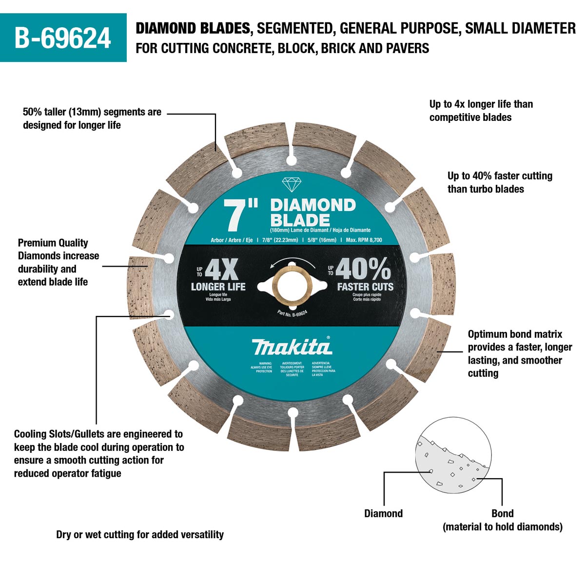 The Makita 7″ Segmented Rim Diamond Blade is ideal for general purpose cutting applications including block, brick and cured concrete. The segmented slots are engineered to deliver a faster yet cooler cut. Diamond blades are part of Makita’s growing line-up of solutions for concrete applications.