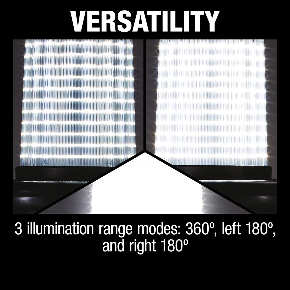 Other features include a dust and water-resistant construction (IP54-rated when using battery) for improved operation in harsh job site conditions and AC inlet and outlet for chaining multiple upright lights together. This allows for illumination throughout the job site, from room to room. Convenient carrying handles provide and a balanced side position allow for easy transportation.
