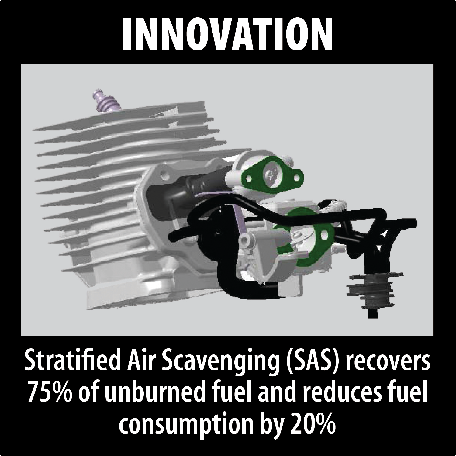 - Stratified Air Scavenging (SAS) sends air flow through the transfer port to push the burned gases through the exhaust outlet recovering 75% of unburned fuel and reducing fuel consumption by 20%