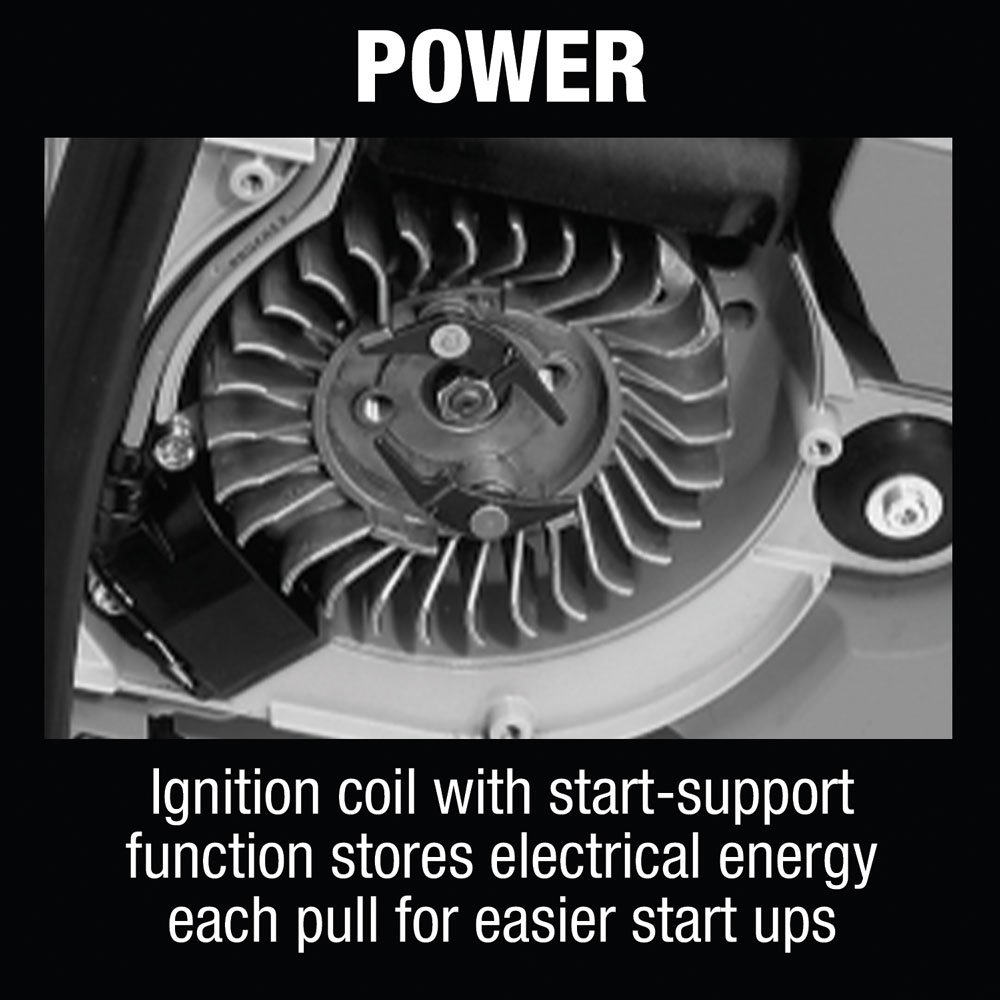 - Improved ignition system with large flywheel and rare earth magnets create more efficient power.