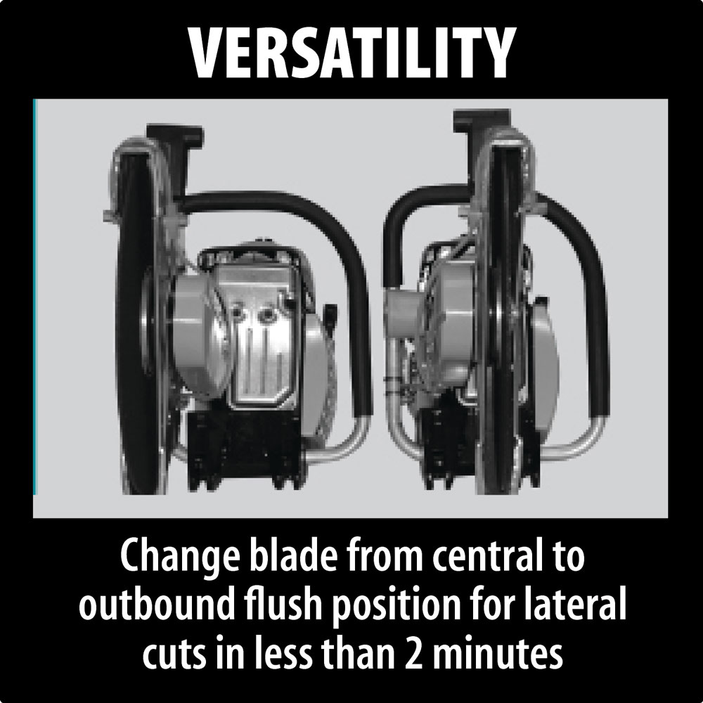 - Cutting arm position simply changes from center position to flush (outboard) position allowing cuts directly adjacent to curb edges, wall or directly above the ground