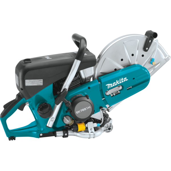 Makita’s MM4 4 stroke motor is easier to start. A clear primer bulb makes easier cold starts. Single lever on/off choke operation simplifies starting. The automatic engine decompression valve reduces pull start force up to 40%. With a noise rating of 92.7dB(A) the EK7651H is easier on your ears as well. Fuel consumption is lower, rated at only .45 gallons per hour. This power cutter also has a smoother idle for continuous operation. The engine has a 3 ring piston which is engineered for improved durability. This also means reduced exhaust and intake carbon build-up. As a result, you get longer cylinder life. Additionally, the cushioned operator grip has 4 vibration absorbing rubber buffers. Last but not least, integrated all aluminum wheels reduce fatigue during long straight cuts and retract when not in use.