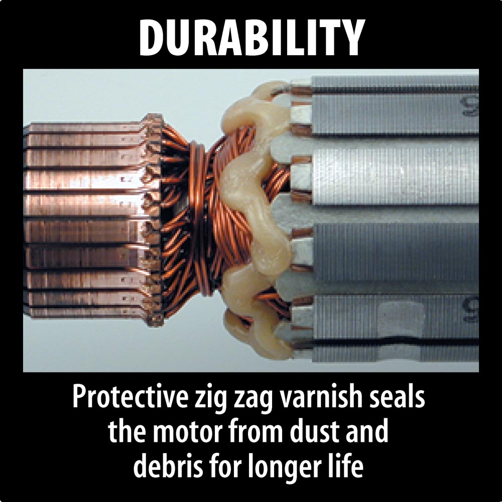 The GA5010Z is powered by a 10.5 AMP motor that delivers 11,000 RPM, with electric brake for maximum productivity. Labyrinth construction protects the motor with a complex set of channels, prohibiting dust and contamination. In addition, the protective zig-zag varnish seals the motor and bearings from dust and debris by creating a barrier under rotation.
