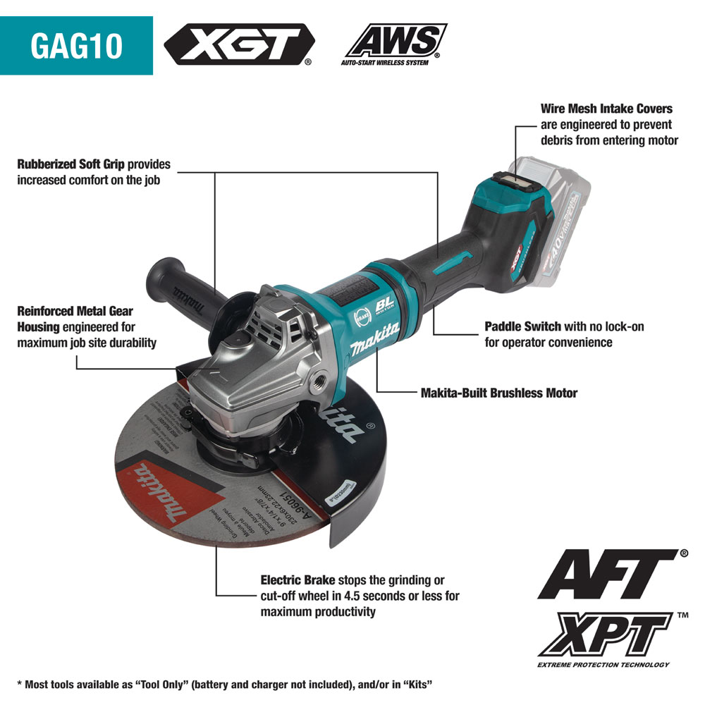 - Makita GAG10M1 features an automatic-start Wireless System (AWS)