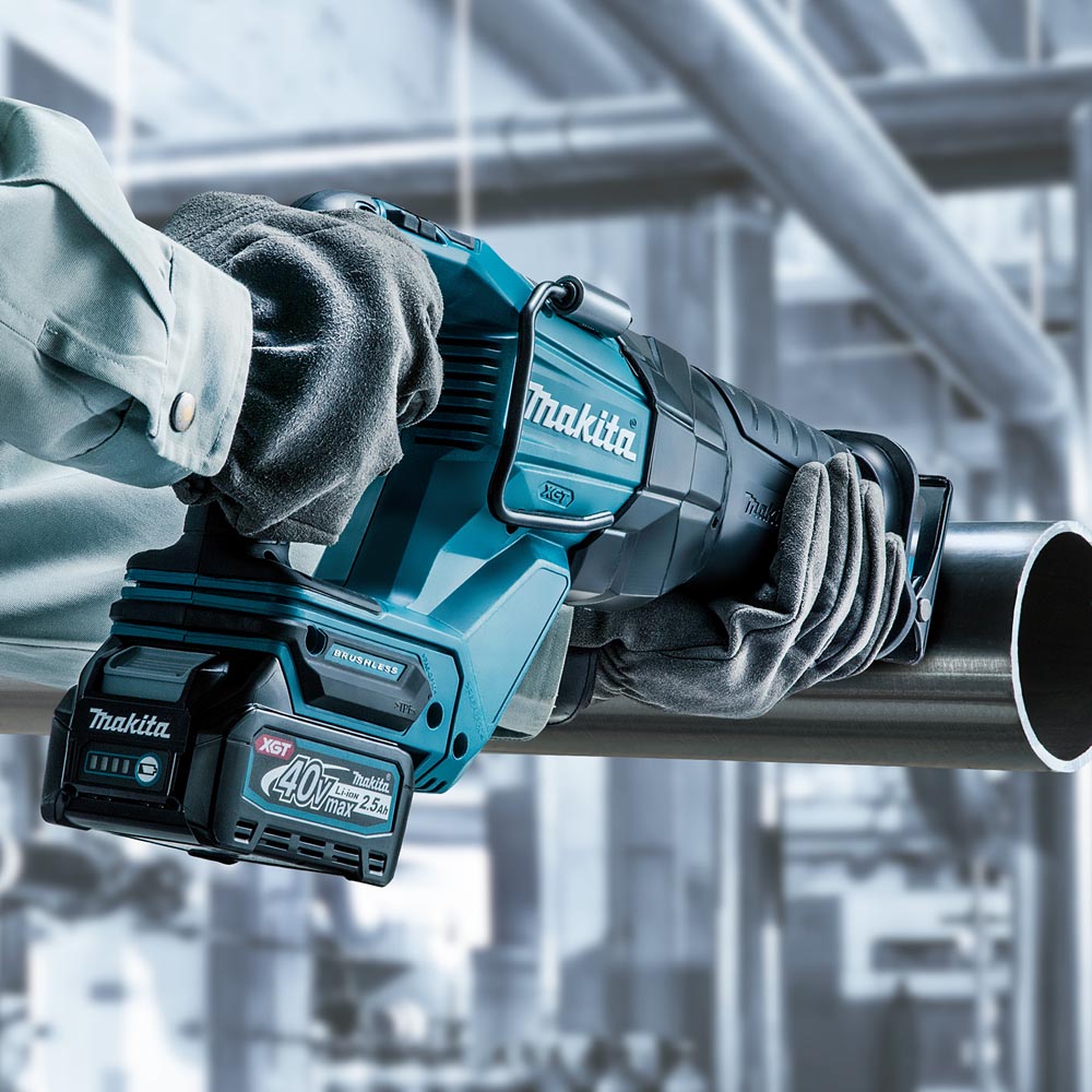 The 40V max XGT® Recipro Saw Kit (GRJ01M1) delivers faster cutting speed for cutting and demolition applications. Makita-built variable 2-speed brushless motor delivers 0-2,300 (low) and 0-3,000 (high) strokes per minute. XGT® technology delivers up to 145 cuts per charge in 2×10 SPF lumber using one XGT 4.0Ah Battery.