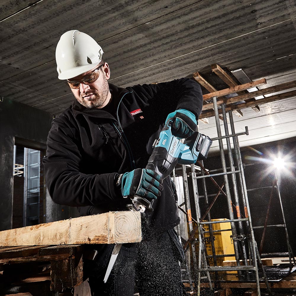 The GRJ01M1 is equipped with efficiency features for faster cutting. The long 1-1/4” stroke length increases cutting efficiency, and the refined crank mechanism design minimizes blade deflection and reduces vibration. Convenience features include a large two-finger variable speed trigger, electric brake, built-in L.E.D. light and a tool-less blade change for faster blade installation and removal. Ergonomically designed handle for difficult cutting applications, such as overhead.