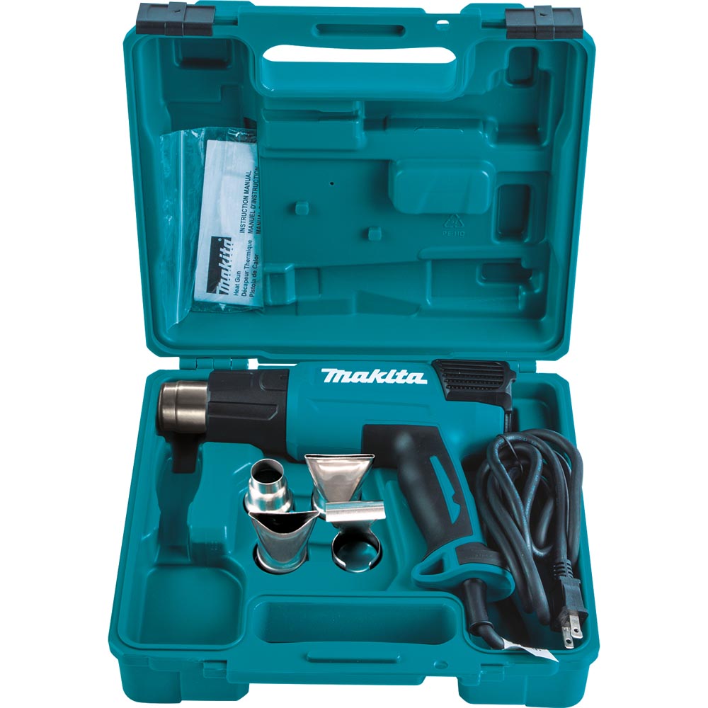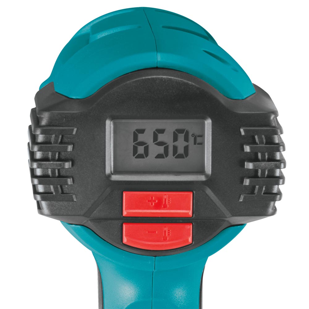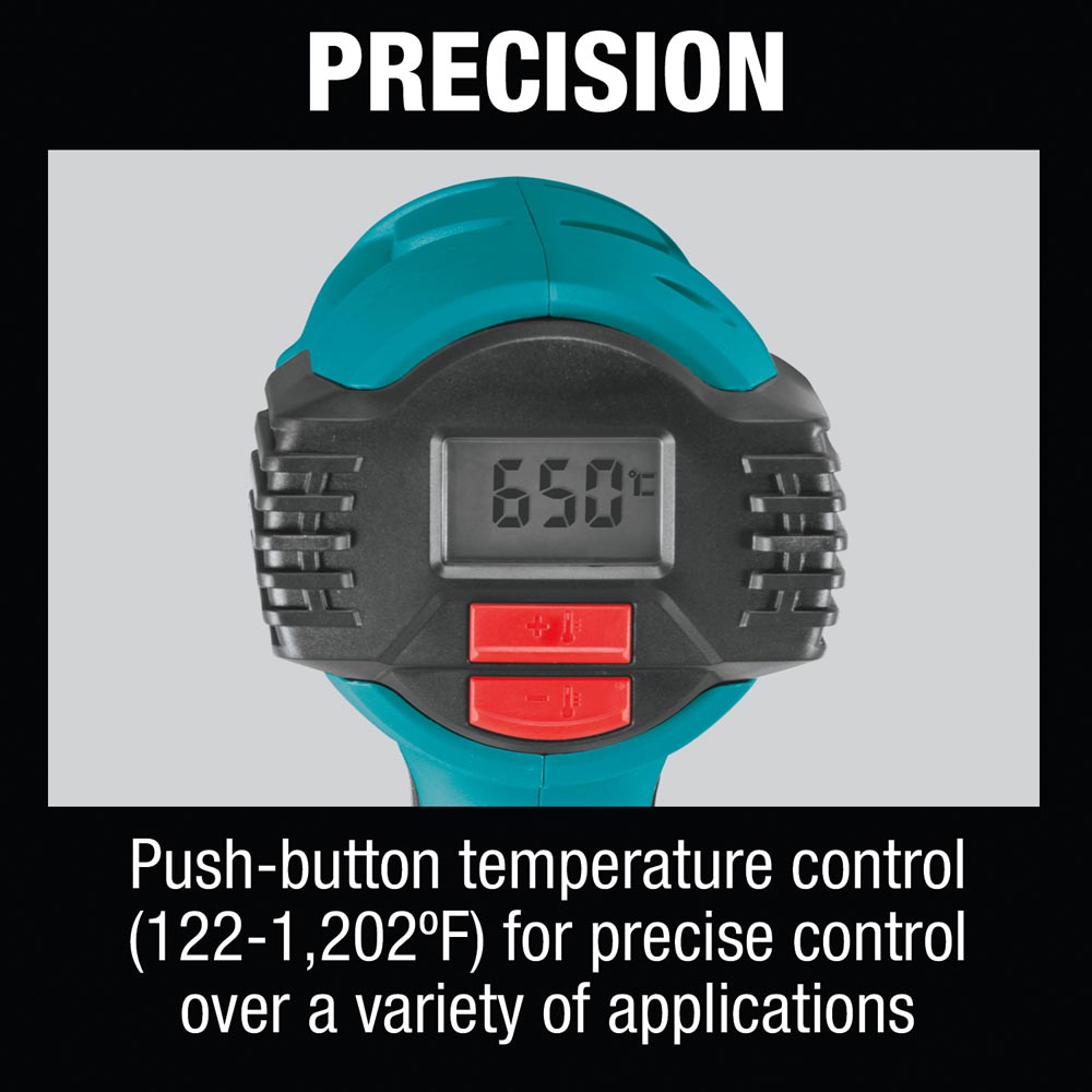 The Makita Variable Speed Heat Guns are engineered for industrial applications including vehicle wraps and tinting, stripping lacquer, paint and varnish, thawing frozen pipes, loosening tile and putty, re-melting adhesive, removing stickers, waxing and de-waxing, bending plastic pipes and sheets, and more. The HG6530VK is 2000W and features precise temperature control with a push-button temperature control (122° – 1,202° F) and slide switch for three air flow settings so the user can set the heat and blower speed to the application.