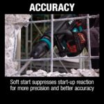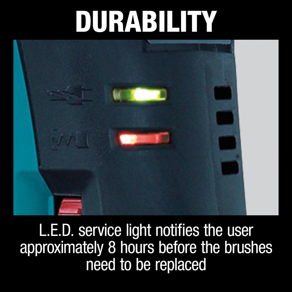 Other features include an L.E.D. power light to indicate switch failure or cord damage and an L.E.D service light that notifies the user that the brushes need to be replaced. An automatic brush cut-off protects the commutator from damage for longer tool life. The 12 bit angle settings allows the bit to be set a different positions for operator comfort.