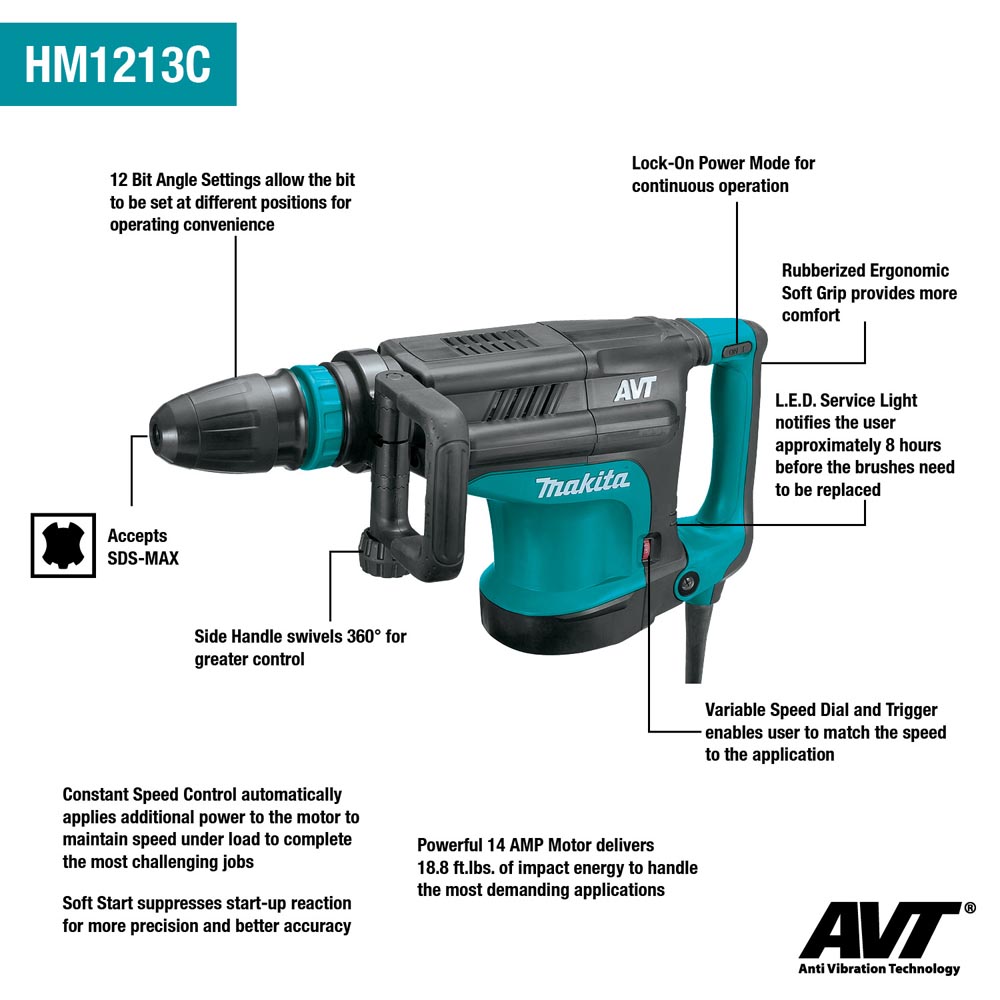 The HM1213C has a “soft no-load” function automatically reduces the speed of the motor when not in use which helps increase tool life and performance. The Makita Motor is engineered with field core interlocking steel laminations, dual ball bearing armature and more copper commutator bars, increasing energy transfer efficiency for more power and longer tool life