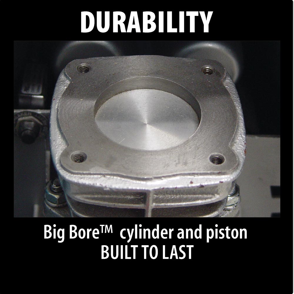 The Makita 2.0 HP Air Compressor is equipped with Makita’s Big Bore™ engineered pump cylinder and piston for higher output, less noise and improved jobsite performance. Powered by a 2.0 HP motor. The Makita Big Bore engineered pump with cast iron cylinder has greater bore and stroke for increased compression, faster recovery and less noise.