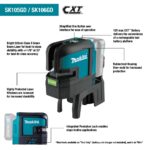 Lasers are typically utilized in the early stages of construction, and measurement needs will vary based on application requirements. The Makita 12V max CXT® Lithium-Ion Self-Leveling Cross-Line Green Beam Laser (SK105GDNAX) gives the user a cordless solution for selectable horizontal/vertical cross reference lines required for level, align, and plumb applications. Depending on ambient light in the working environment, the SK105GDNAX has a line visibility range up to 115′ and is detectable up to 262’ with a Makita Laser Detector (sold separately).